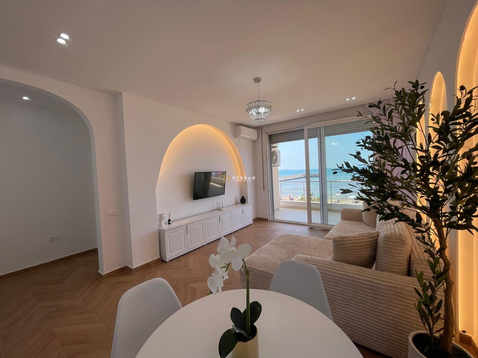 Apartamenti eshte i organizuar nga salla ndenjes bashkangjitur me kuzhinen e cila ofron nje pamje fantastike deti gjithashtu dhe nje dhome gjumi me full pamje deti.